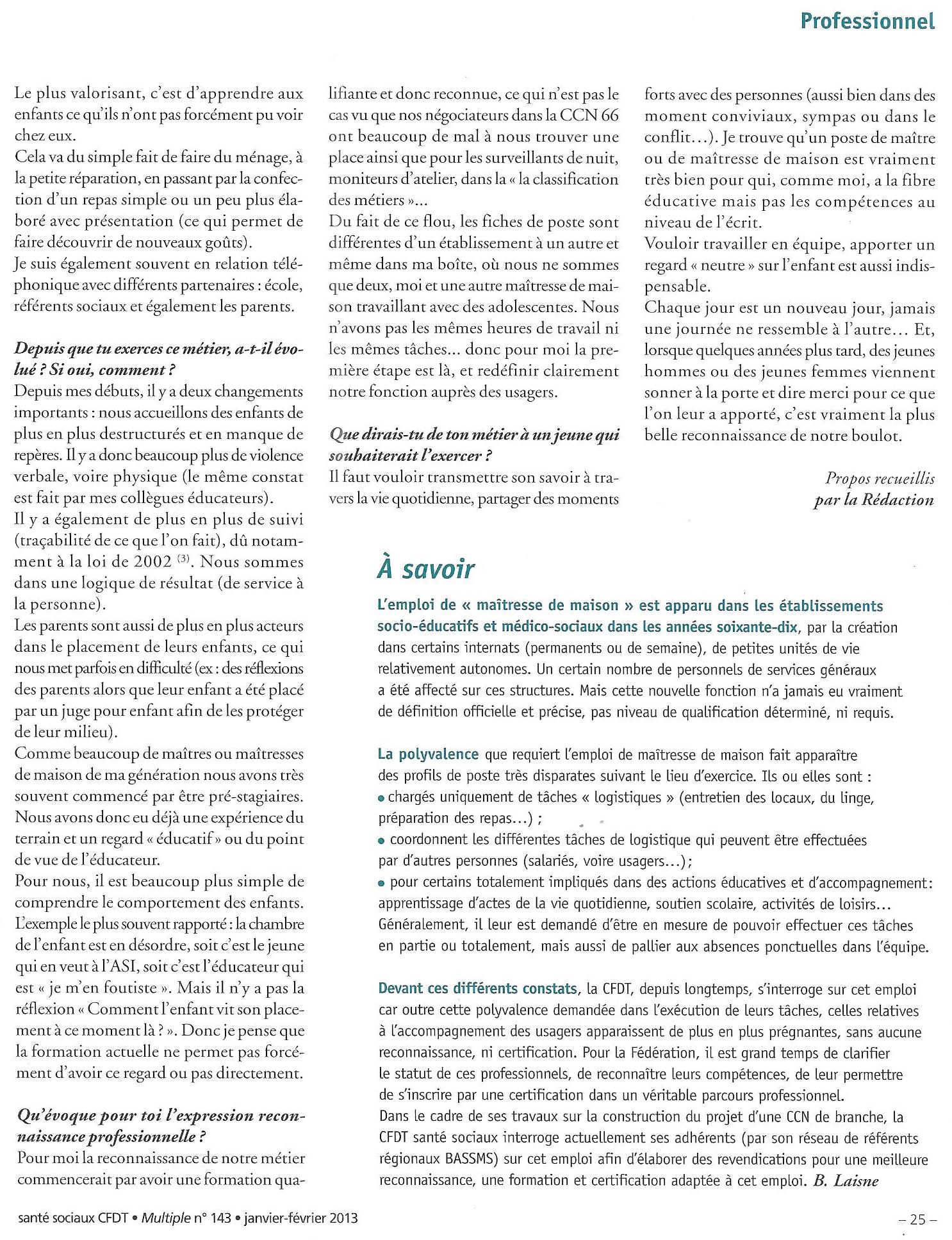 Maître de Maison : un article paru dans le magazine MULTIPLE CFDT SANTE SOCIAUX de Janvier-Février 2013