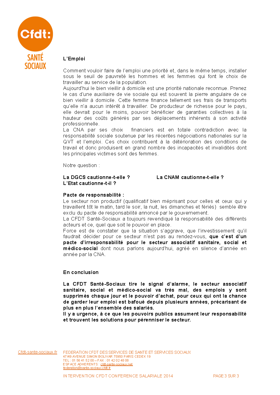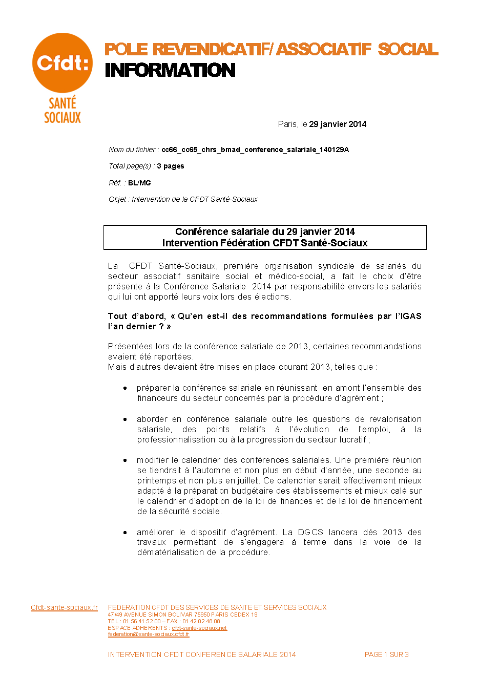 Conférence Salariale du Mercredi 29 Janvier 2014 Intervention Fédération CFDT Santé-Sociaux