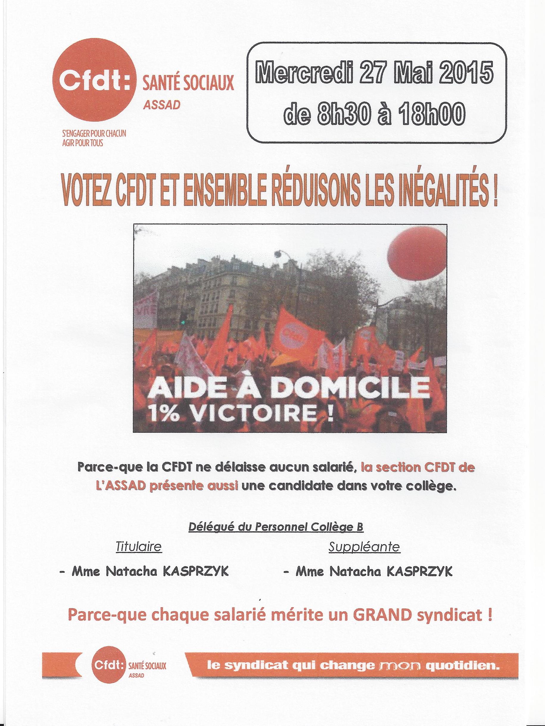 En vue des élections professionnelles prévu le Mercredi 27 Mai 2015 de 8h30 à 18h00, la Section CFDT a continué d’aller à la rencontre des salariés de L’ASSAD le Mercredi 13 Mai 2015 pour les informer en leur distribuant un tract.