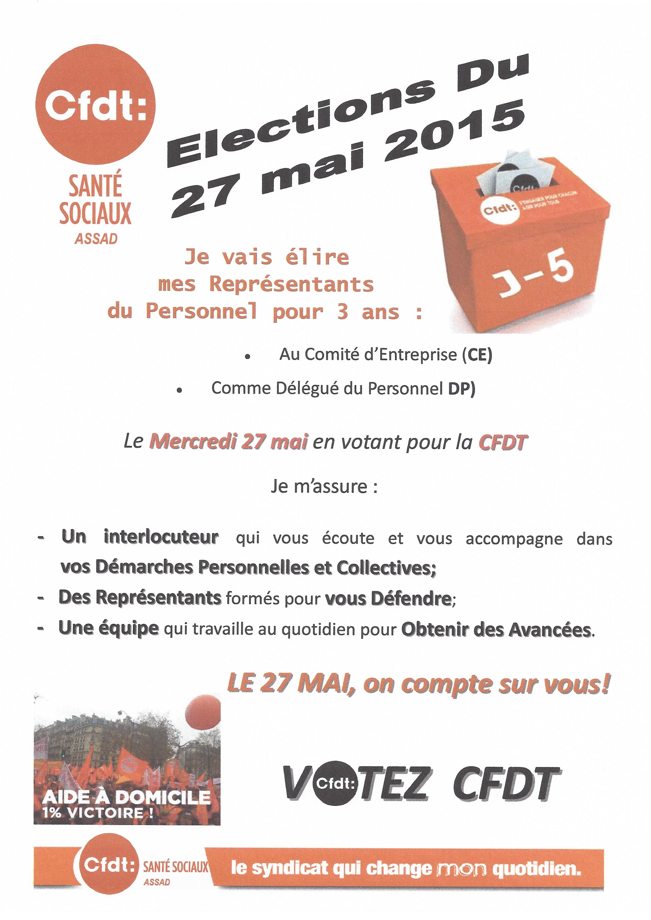 En vue des élections professionnelles prévu le Mercredi 27 Mai 2015 de 8h30 à 18h00, la Section CFDT pour la quatrième fois est aller à la rencontre des salariés de L’ASSAD, le Vendredi 22 Mai 2015 pour les informer en leur distribuant un tract.