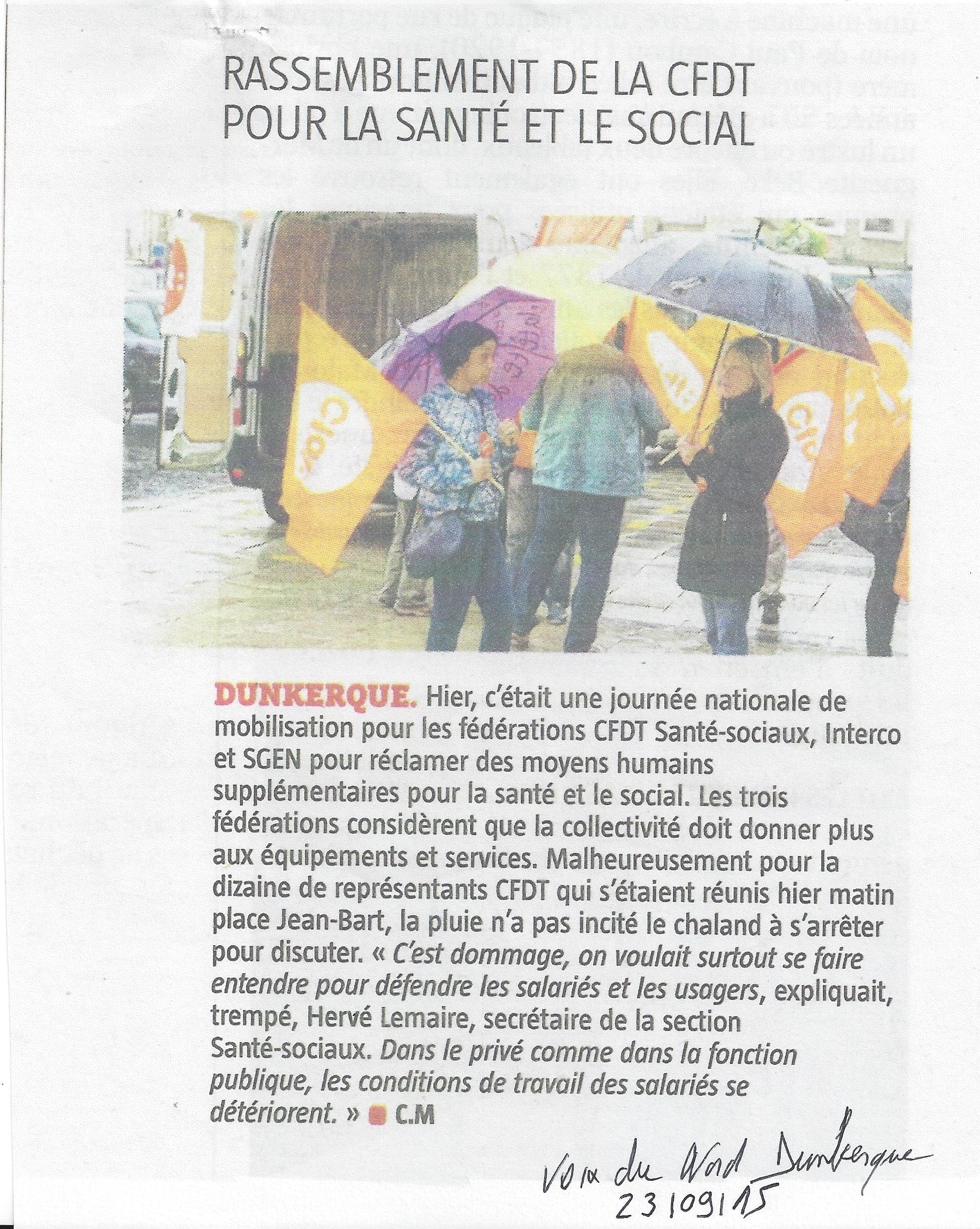 Trouvez ci-dessous un article de « La Voix du Nord » du Mercredi 23 Septembre 2015 concernant la mobilisation du syndicat Santé Sociaux à Dunkerque.