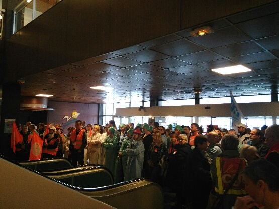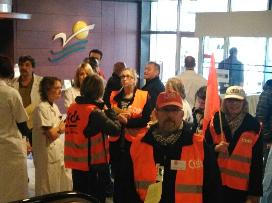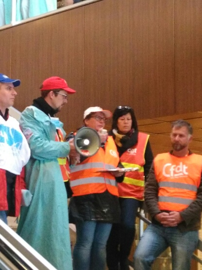 Une Intersyndicale » CFDT, CGT et UNSA » s’est formée et a appelé à une assemblée, ce mardi 03 novembre 2015 de 10h00 à 11h00 dans le hall. Près de 1500 personnes étaient présente au moment du conseil de surveillance.