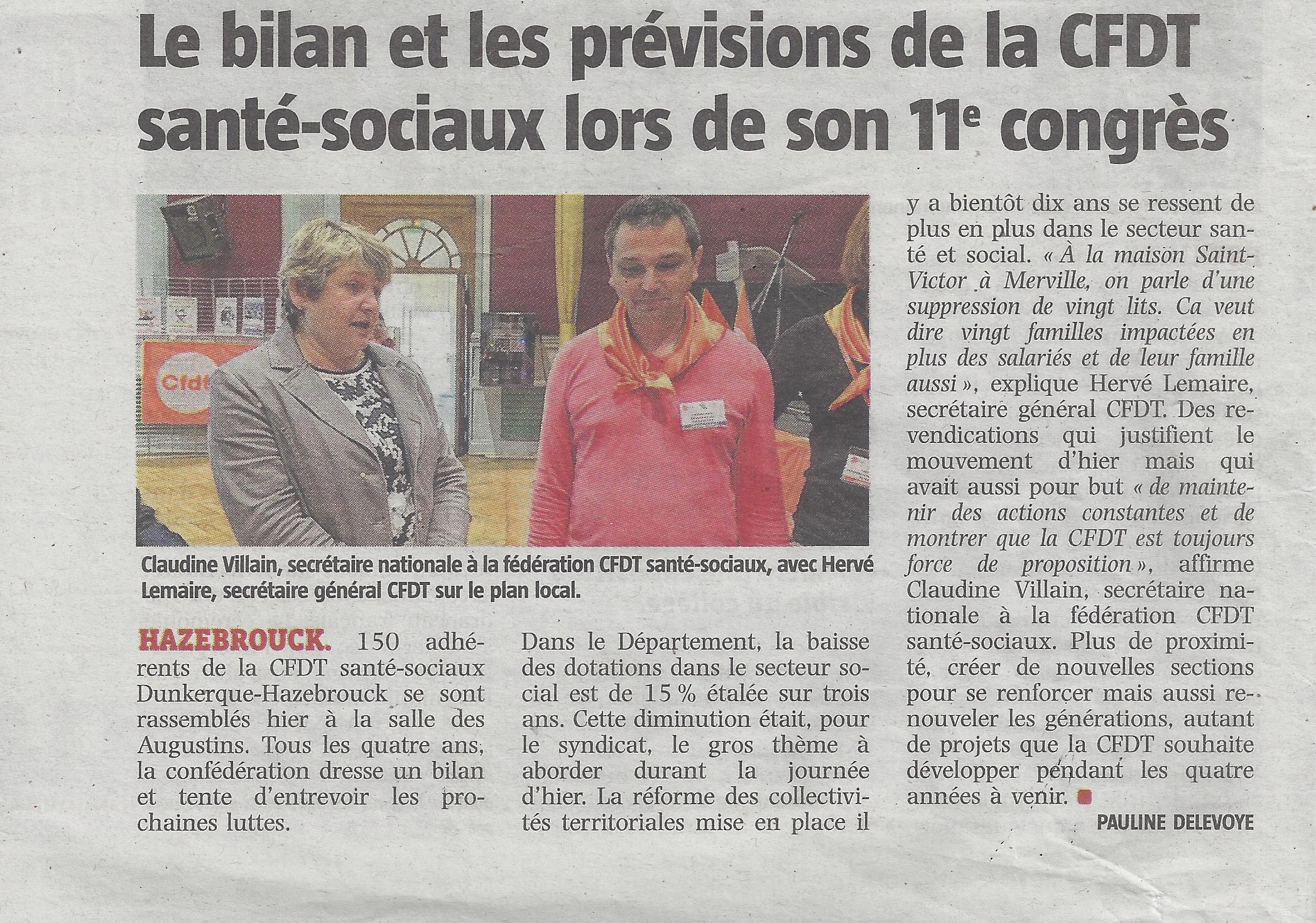 Trouvez ci-dessous un article du Journal « La Voix du Nord de HAZEBROUCK ET LA FLANDRE » du Mercredi 01 Juin 2016 concernant notre 11ème Congrès du syndicat Départemental CFDT des Services de Santé et des Services Sociaux de DUNKERQUE/HAZEBROUCK.