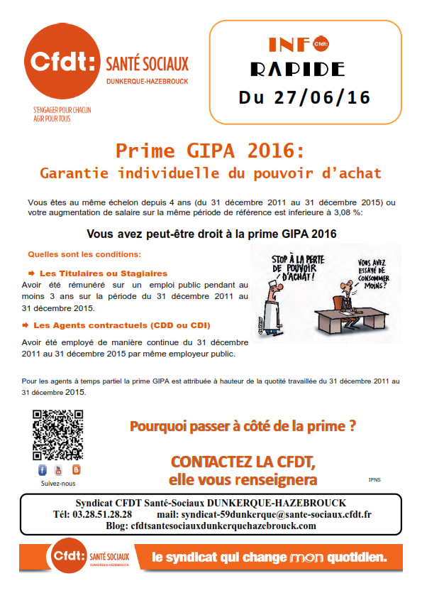 La prime GIPA (Garantie Individuelle du Pouvoir d’Achat) est prorogée pour l’année 2016.