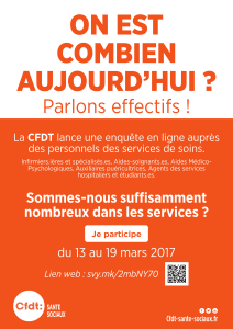 La CFDT Santé Sociaux lance une enquête en ligne, accessible du 13 au 19 mars 2017, auprès des personnels des services de soins : Infirmiers.ières et spécialisés.es, Aides-soignants.es, Aides Médico-Psychologiques, Auxiliaires puéricultrices, Agents des services hospitaliers et étudiants.es.