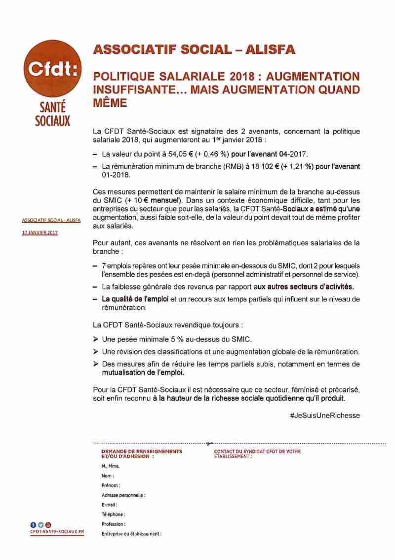 Cet article, publié dans la convention collective ALISFA, est tagué ALISFA, cfdt, cfdtsantesociaux, politique salariale, santé sociaux. Ajoutez ce permalien à vos favoris.