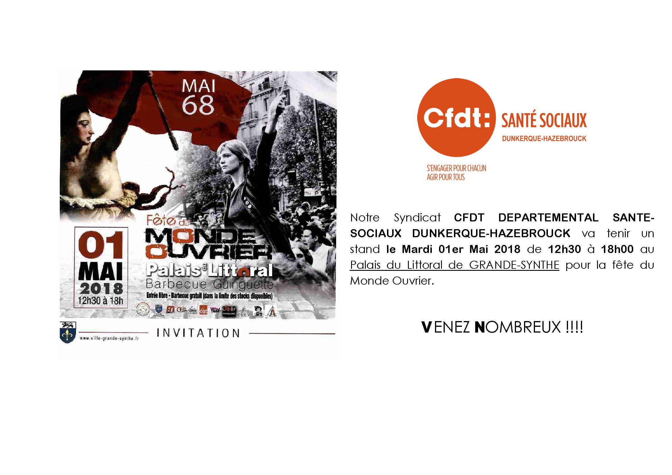 Notre Syndicat CFDT DÉPARTEMENTAL SANTE SOCIAUX DUNKERQUE HAZEBROUCK va tenir un stand le Mardi 01er Mai 2018 de 12h30 à 18h00 au Palais du Littoral de Grande-Synthe pour la fête du Monde Ouvrier.