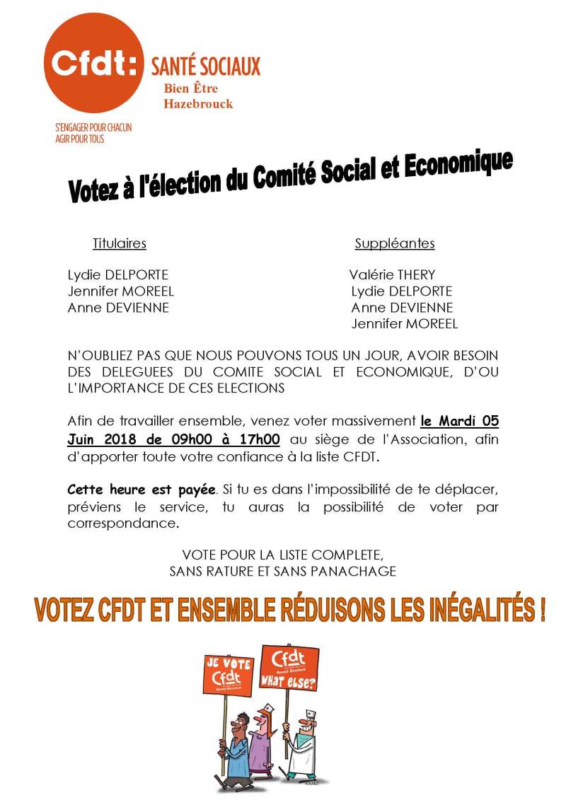 Pour la première fois, une équipe CFDT se présente aux élections du Comité Social et Economique le Mardi 05 Juin 2018 à l’Association Bien Être à Hazebrouck.