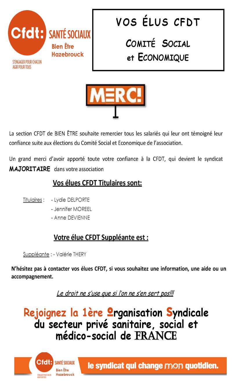 Suite aux élections du Comité Social et Economique de l’association BIEN ÊTRE. Le syndicat CFDT devient MAJORITAIRE dans cette association.