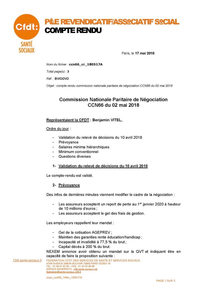 Vous trouverez ci-dessous « en cliquant sur l’image« , le compte-rendu de la Commission Nationale Paritaire de Négociation du mercredi 02 mai 2018. A l’ordre du jour : Prévoyance, Salaire minimum hiérarchique et salaire minimum garantie.