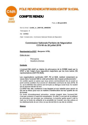Vous trouverez, ci-dessous, « en cliquant sur l’image » le compte-rendu de la commission nationale paritaire de négociation du vendredi 20 juillet 2018. Cette séance fait suite à l’opposition majoritaire à l’avenant 344 signé par la CFDT. Elle devait aboutir à un nouvel accord. Elle fut le théâtre d’une opposition frontale et de la fin probable du régime de prévoyance mutualisé.