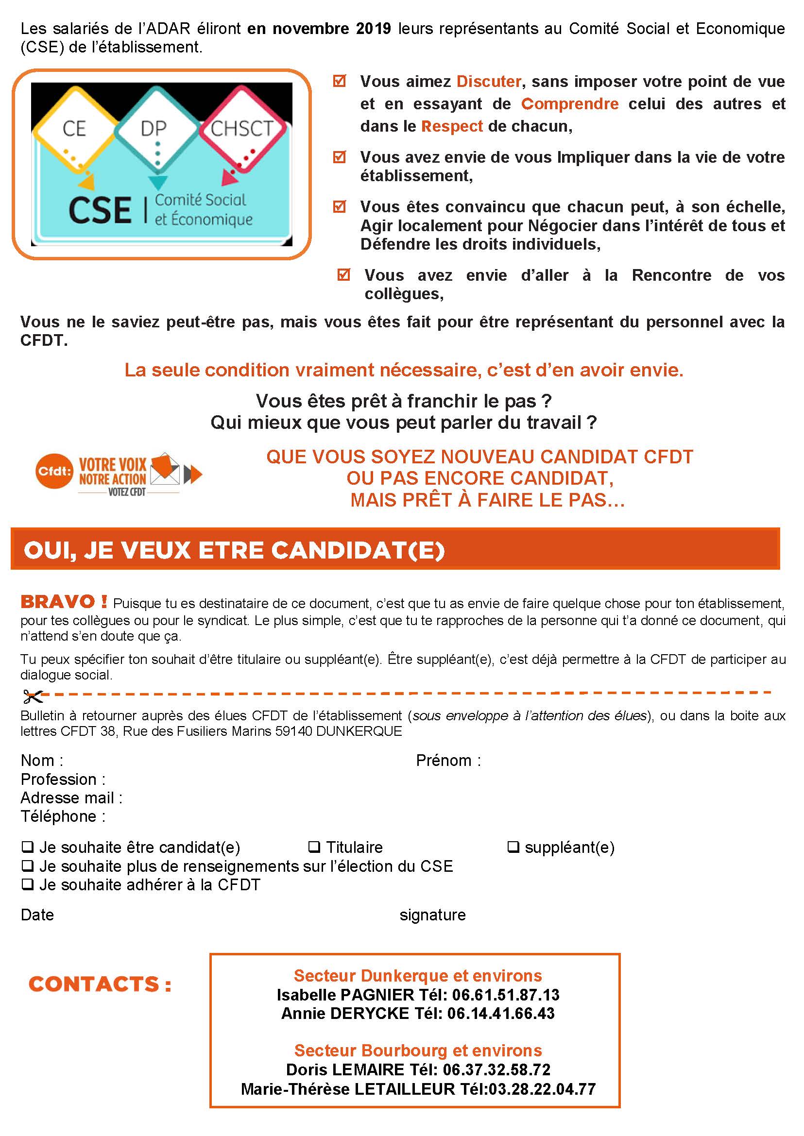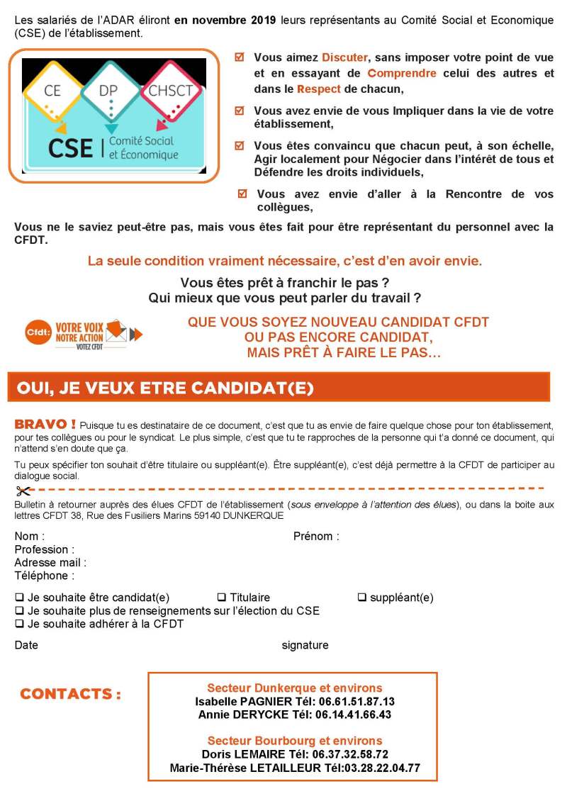 En vue des élections professionnelles prévues en novembre 2019, la Section CFDT et Edwige BLONDEEL ont été à la rencontre des salariés de L’ADAR le 02 Septembre 2019 pour les informer en leur distribuant un tract sur les élections au Comité Social et Economique et leurs droits.
