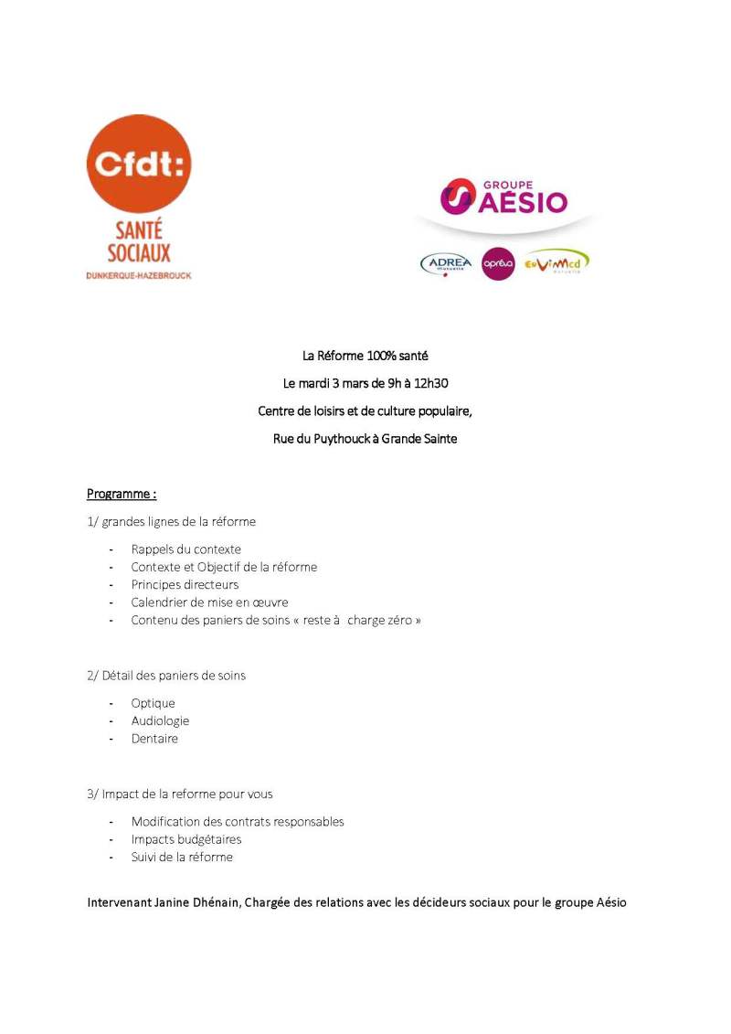 Le Syndicat Départemental Santé Sociaux Dunkerque-Hazebrouck organise une réunion d’information pour les adhérents le Mardi 03 Mars 2020 de 9h00 à 12h30 au Centre de Loisirs et de Culture Populaire – Puythouck de Grande Synthe en partenariat avec le groupe AESIO sur » LA REFORME 100% SANTE« .
