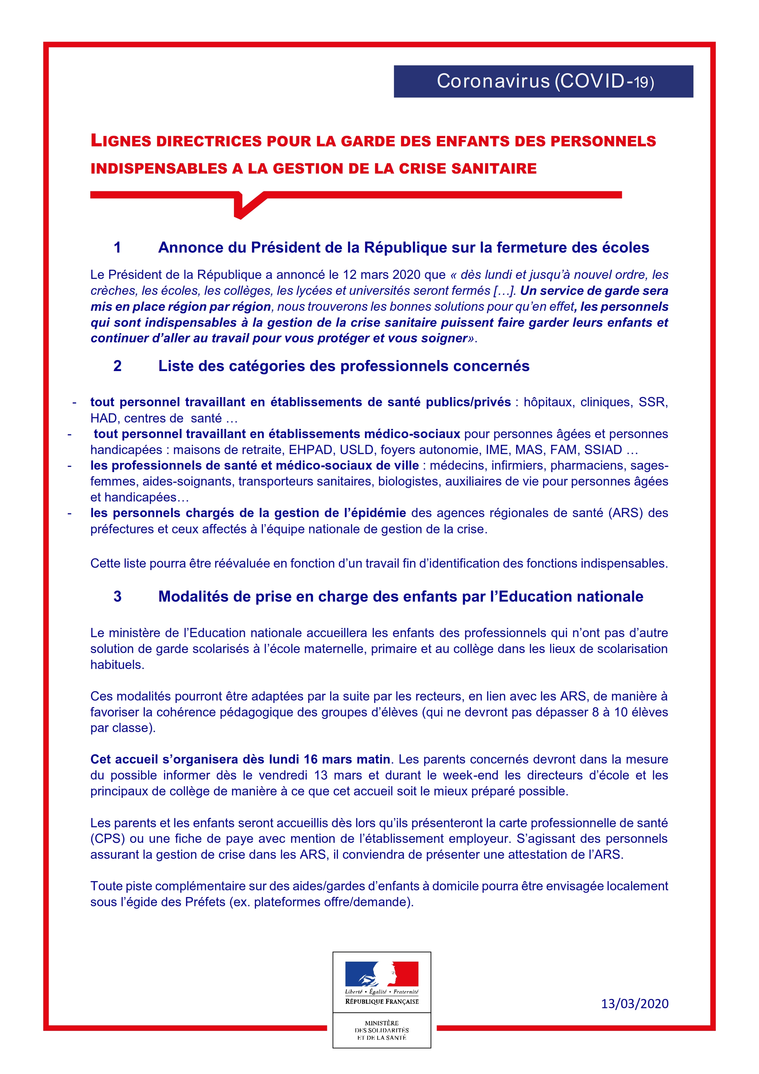 Vous trouverez ci-jointe une note d’information du ministère des solidarités et de la santé sur la garde des enfants de l’ensemble des professionnels de Santé.