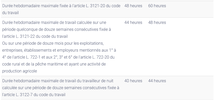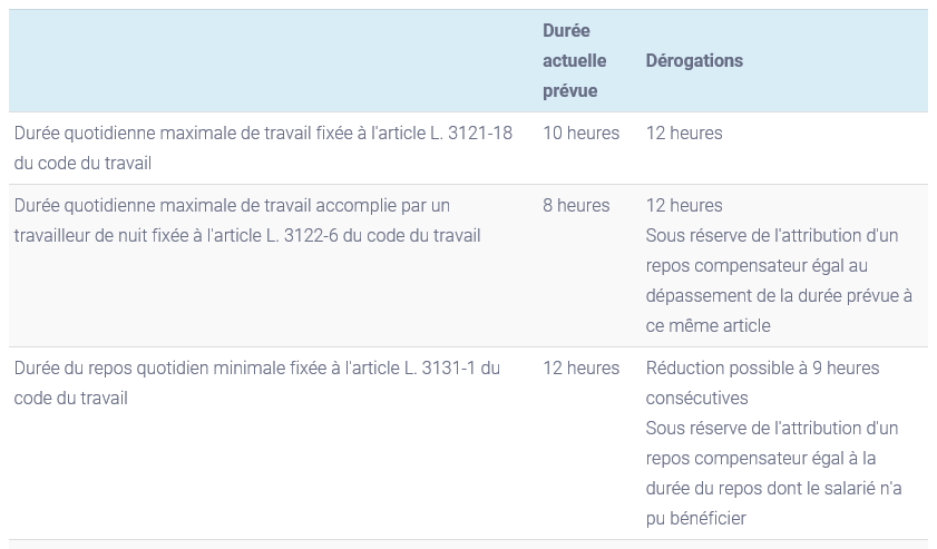 L’article 6 de l’ordonnance permet, de manière temporaire et exceptionnelle, aux entreprises des secteurs jugés essentiels à la continuité de la vie économique et à la sûreté de la Nation, de déroger aux règles d’ordre public en matière de durée quotidienne maximale de travail, de durée quotidienne maximale accomplie par un travailleur de nuit, de durée du repos quotidien, de durée hebdomadaire maximale absolue et moyenne, de durée hebdomadaire de travail du travailleur de nuit.