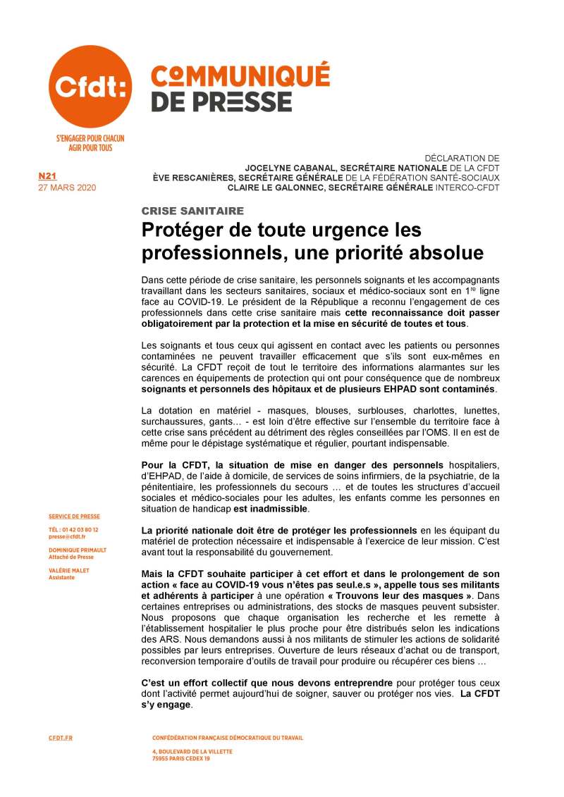 Crise Sanitaire : Protéger de toute urgence les professionnels, une priorité absolue !!!