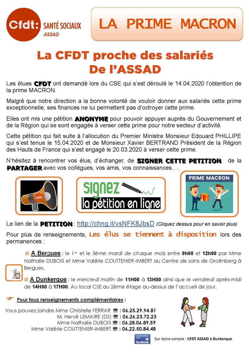Les élus CFDT ont distribué un tract sur la prime MACRON, afin d’informé les salariés de l’ASSAD sur la mise en place d’une PÉTITION pour pouvoir appuyer auprès des pouvoirs publics qui se sont engagés à verser cette prime pour notre secteur d’activité. Qui pendant cette période du Covid-19 ont été exemplaire de PROFESSIONNALISME et mérite entièrement d’obtenir cette RECONNAISSANCE.