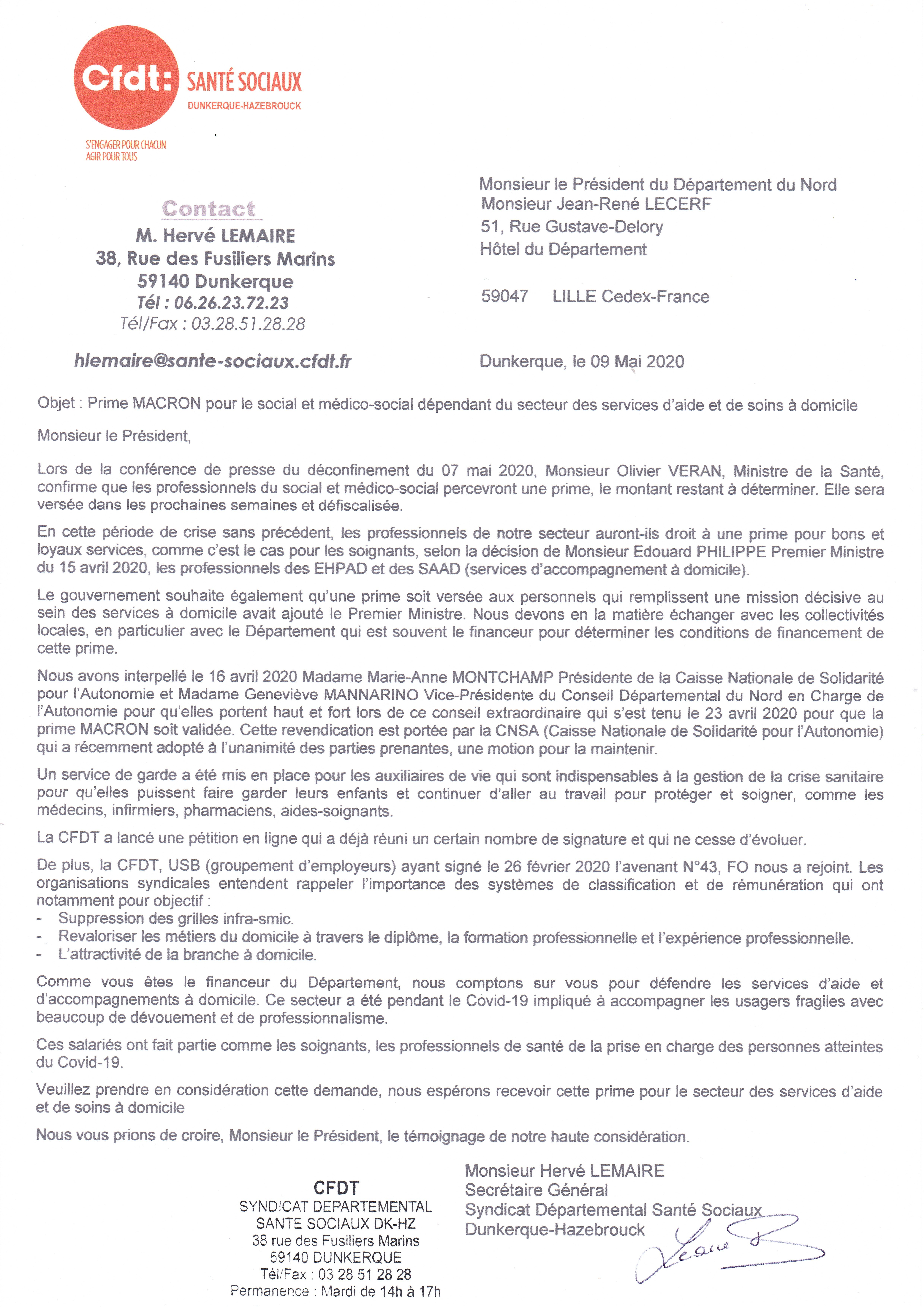 Ci-dessous le courrier transmis à Monsieur Jean-René LECERF Président du Département du Nord pour l’obtention de la prime MACRON pour les salariés des services d’aide et de soins à domicile.
