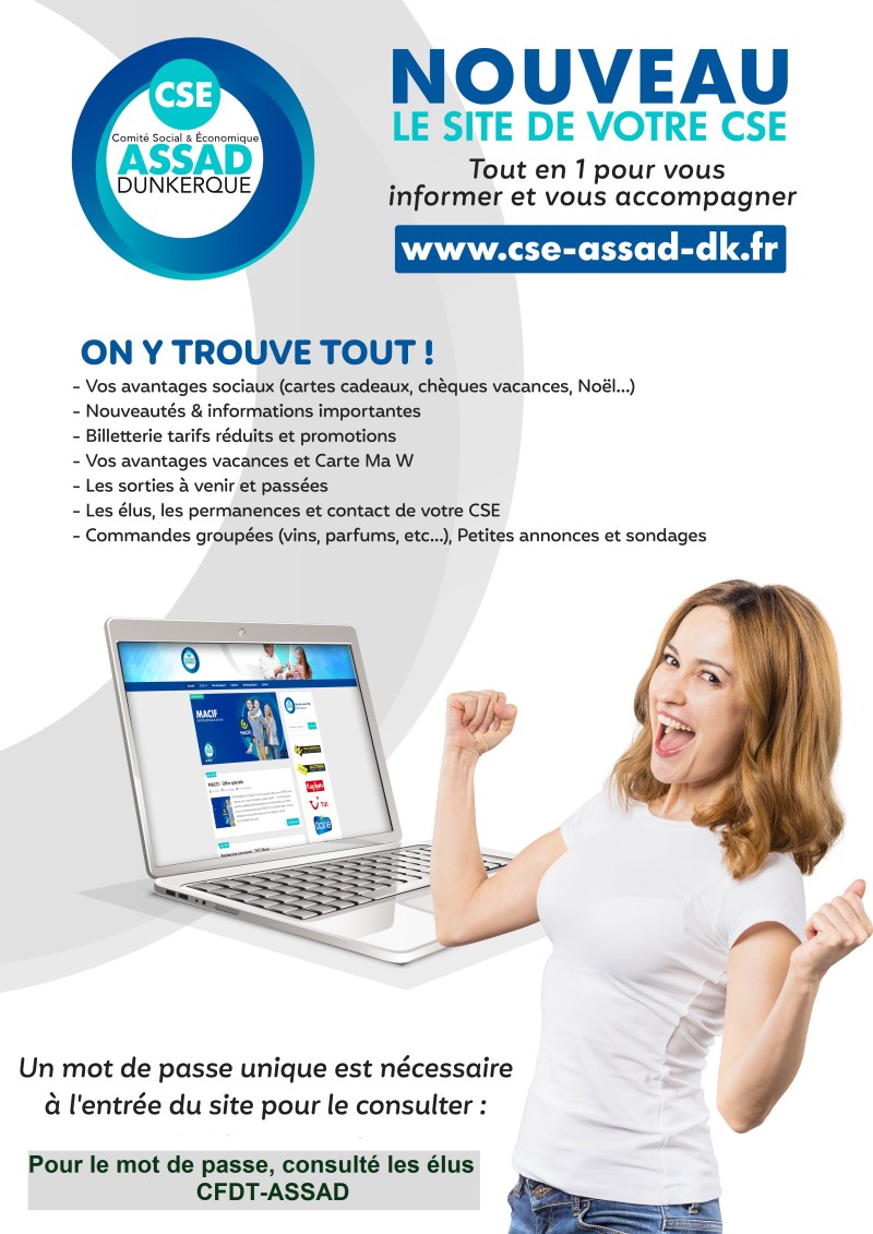 Le CSE-ASSAD lance leur site afin d’être encore plus proche des salariés. Dans ce site, vous y trouverez les avantages sociaux (carte cadeau, chèques vacances, St Nicolas…), billetterie avec des tarifs réduits vendu par le CSE-ASSAD, campings, nos partenaires (MACIF, CAP FUN, TUI STORE DUNKERQUE, WONDERBOX…). Les avantages avec la carte WENGEL, les comptes rendus du CSE et CSSCT, une Newsletter pour les salariés puissent recevoir des informations, et plein d’autres choses que vous pourrez découvrir en naviguant sur notre site. (Tout ceci dans le respect de la loi RGPD).