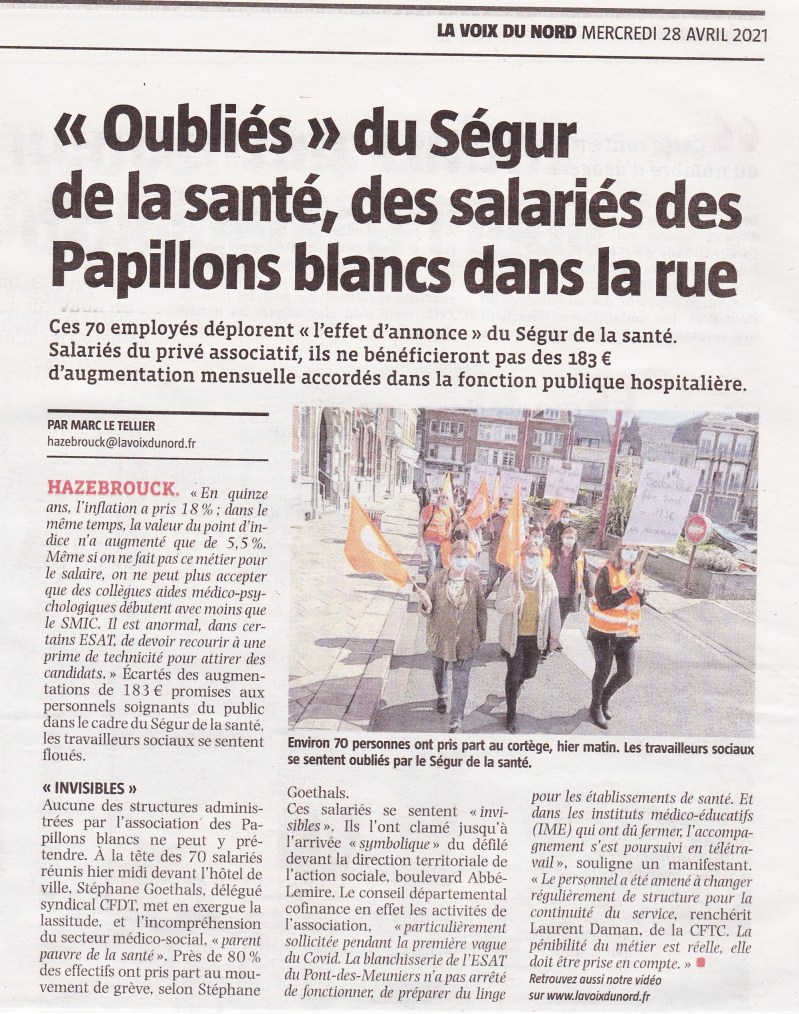 Les salariés des Papillons Blancs d’Hazebrouck ont défilé ce mardi 27 avril, jusque la direction territoriale de l’action sociale pour que le secteur medico-social ne soit pas l’oublié du SEGUR