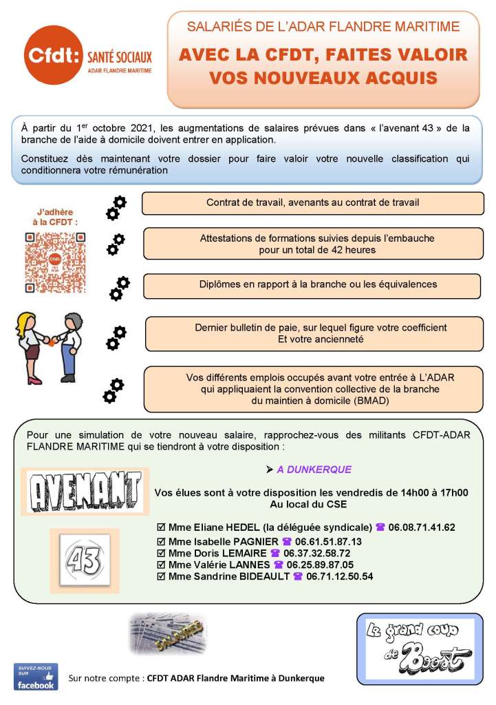 Pour une simulation de votre nouveau salaire, rapprochez-vous des militants CFDT–ADAR FLANDRE MARITIME qui se tiendront à votre disposition :