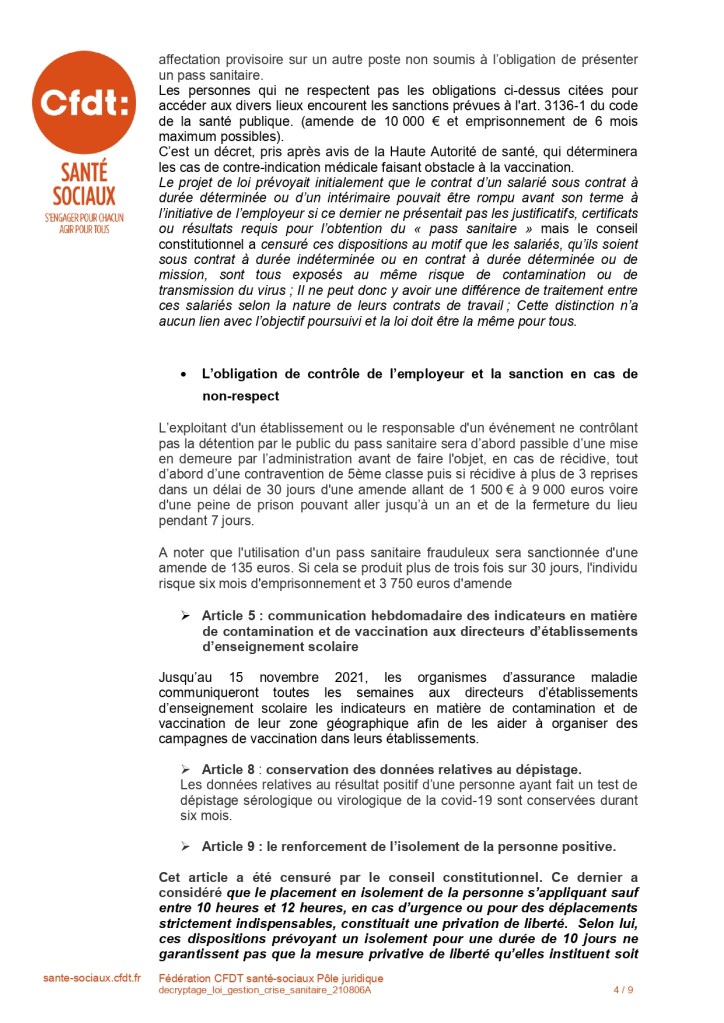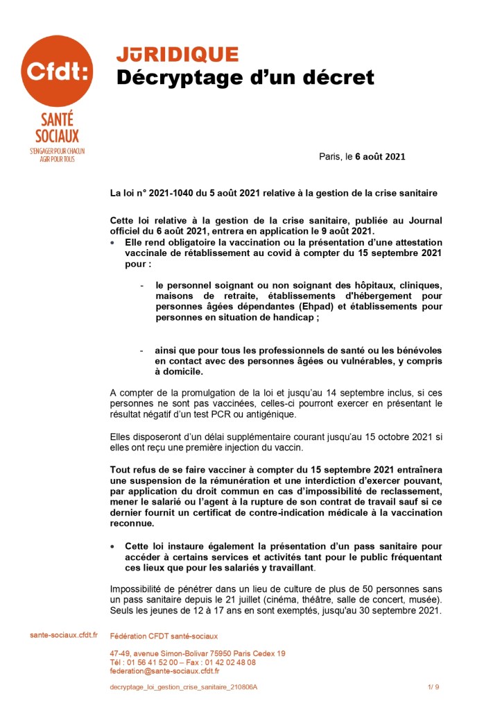Veuillez trouver ci dessous, un courrier explicatif de la nouvelle relative à la gestion de crise sanitaire , dans le cadre de l’obligation du Passe Sanitaire au sein des secteurs Sanitaires, Sociaux et Médico-Sociaux