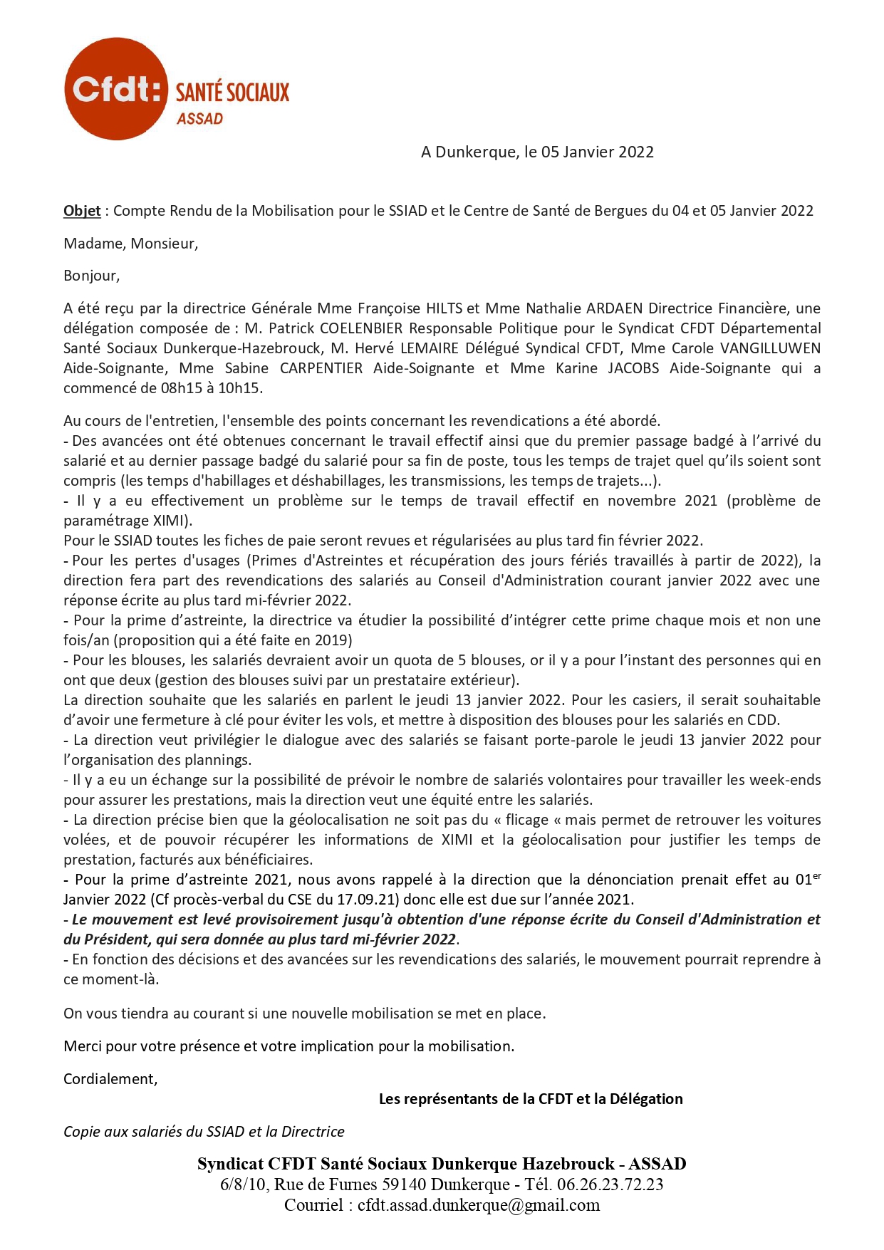 – Pour les pertes d’Usages (Primes d’Astreintes et récupération des jours fériés travaillés à partir de 2022), la direction fera part des revendications des salariés au Conseil d’Administration courant janvier 2022 avec une réponse écrite au plus tard mi-février 2022.