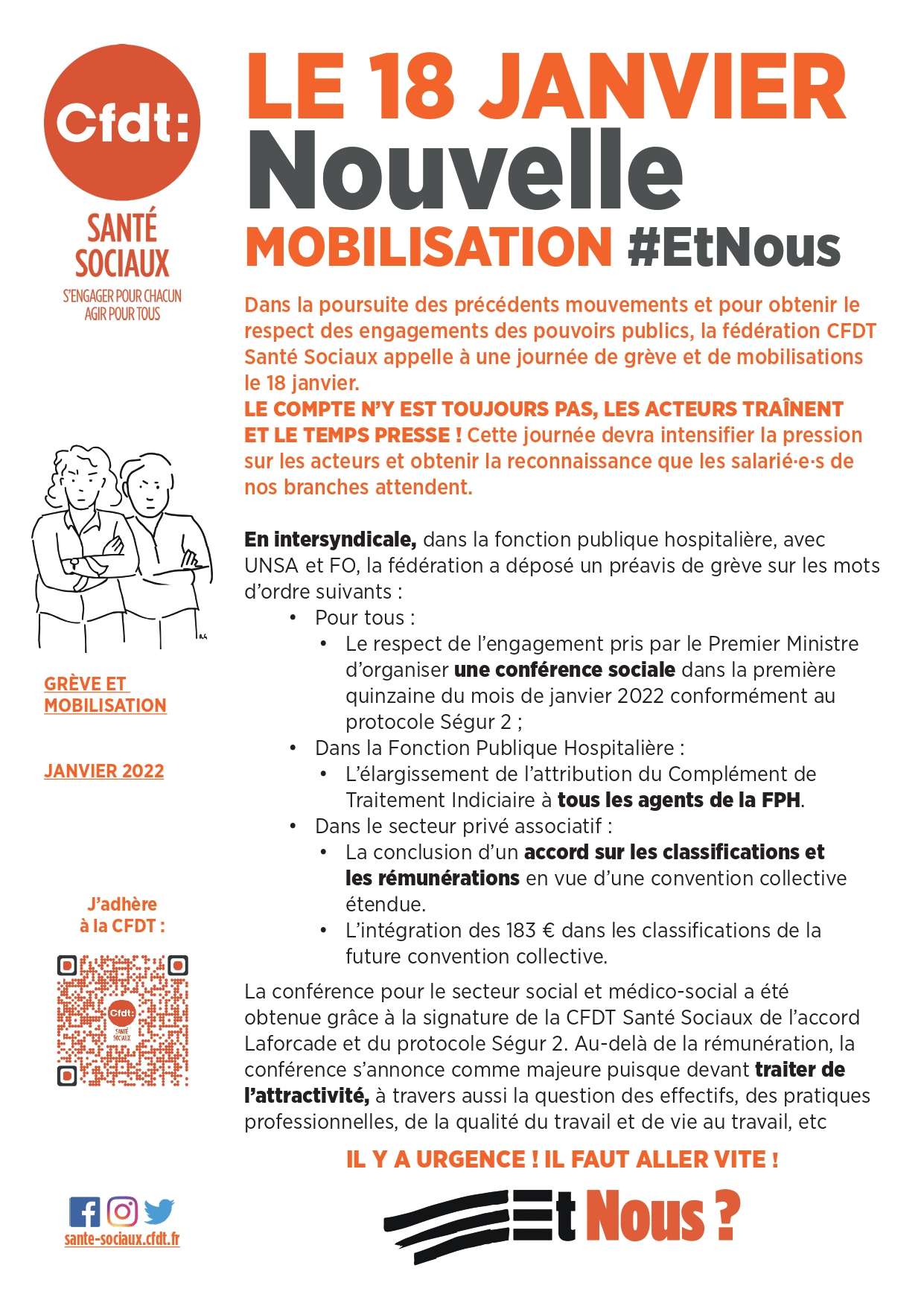 Dans le secteur privé associatif – BASSMS – , et la fonction publique hospitalière – FPH – une nouvelle journée de grève et de mobilisations #EtNous sont prévues, le mardi 18 janvier 2022.