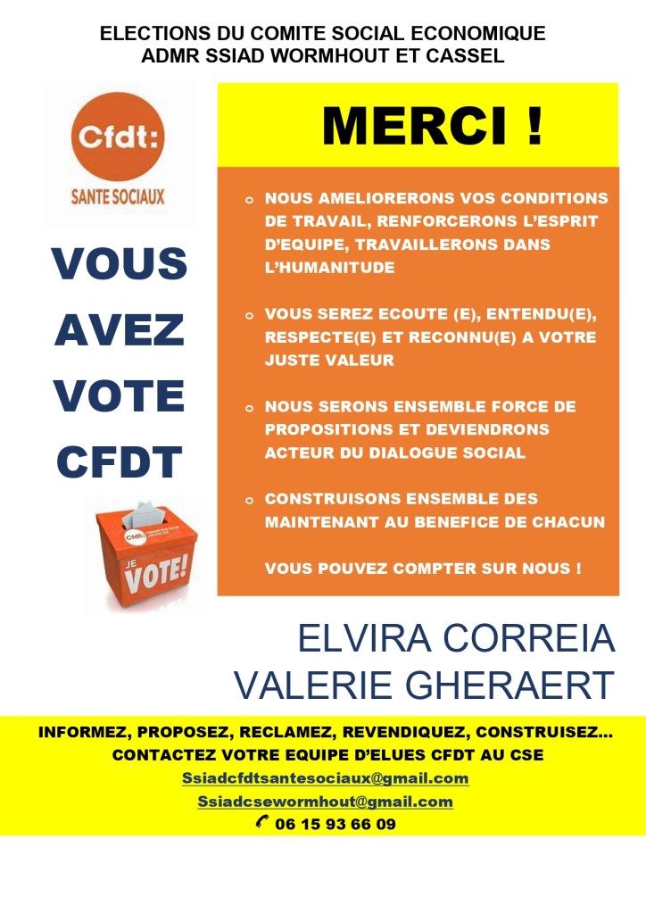 Cet article, publié dans Actualités, ADMR SSIAD Wormhout Cassel, Informations, Vie des Sections, est tagué ADMR SSIAD Wormhout Cassel, élections, cdft, majorité, syndicat cfdt sante sociaux. Ajoutez ce permalien à vos favoris.