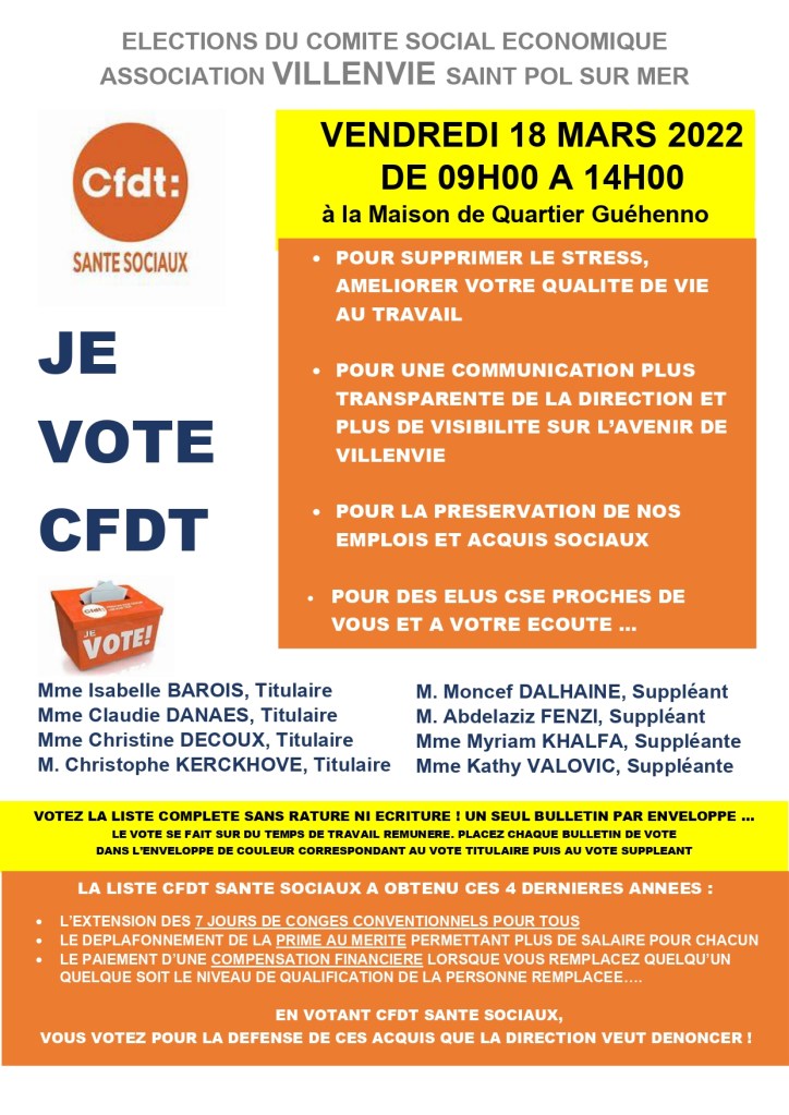 Le Vendredi 18 mars aura lieu les élections du CSE à VILLENVIE….. Votez CFDT