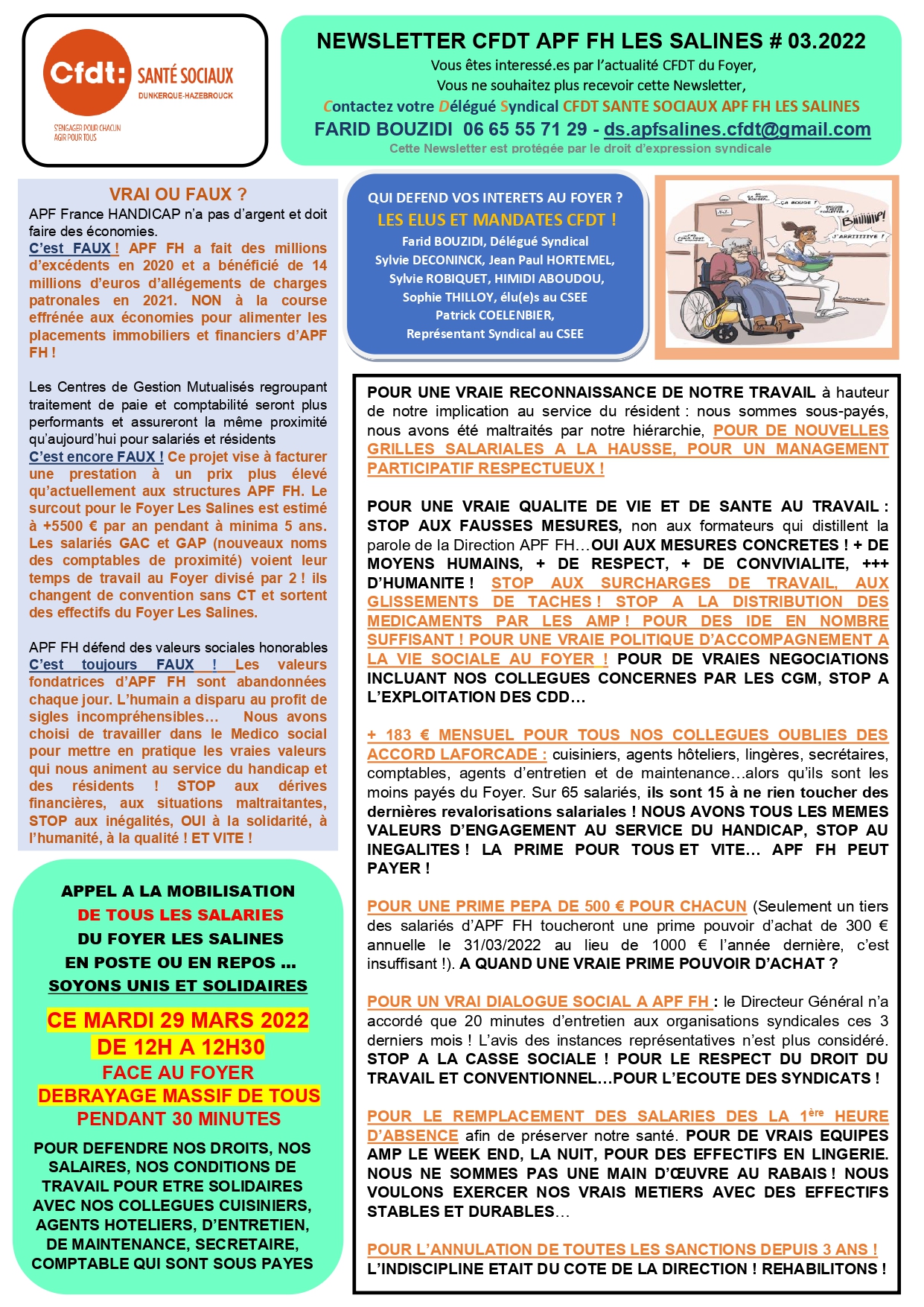 - la prime PEPA versée ce mois-ci uniquement à un tiers des salariés par APF FH alors que 70% des salaires appliqués à APF FH sont peu élevés. La revalorisation du pouvoir d’achat est aujourd’hui une priorité pour tous !