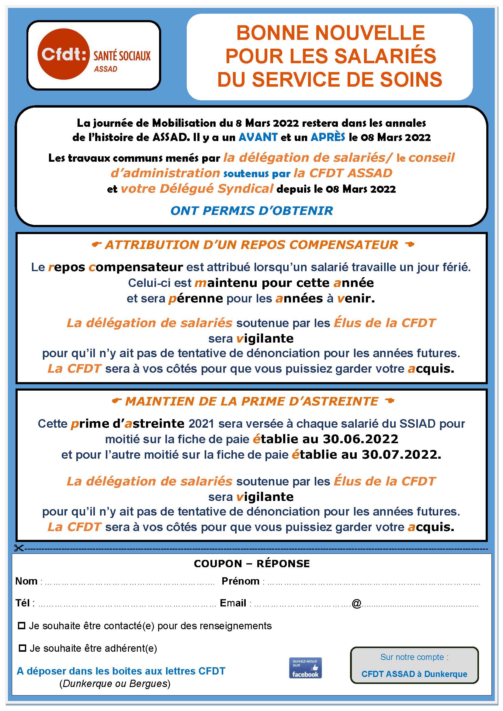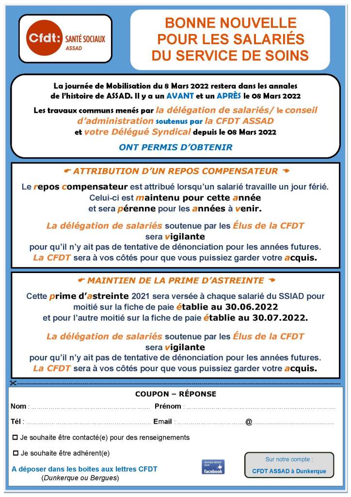 Les travaux communs menés par la délégation de salariés/le conseil d’administration soutenus par la CFDT ASSAD et votre Délégué Syndical depuis le 08 mars 2022 ONT PERMIS D’OBTENIR