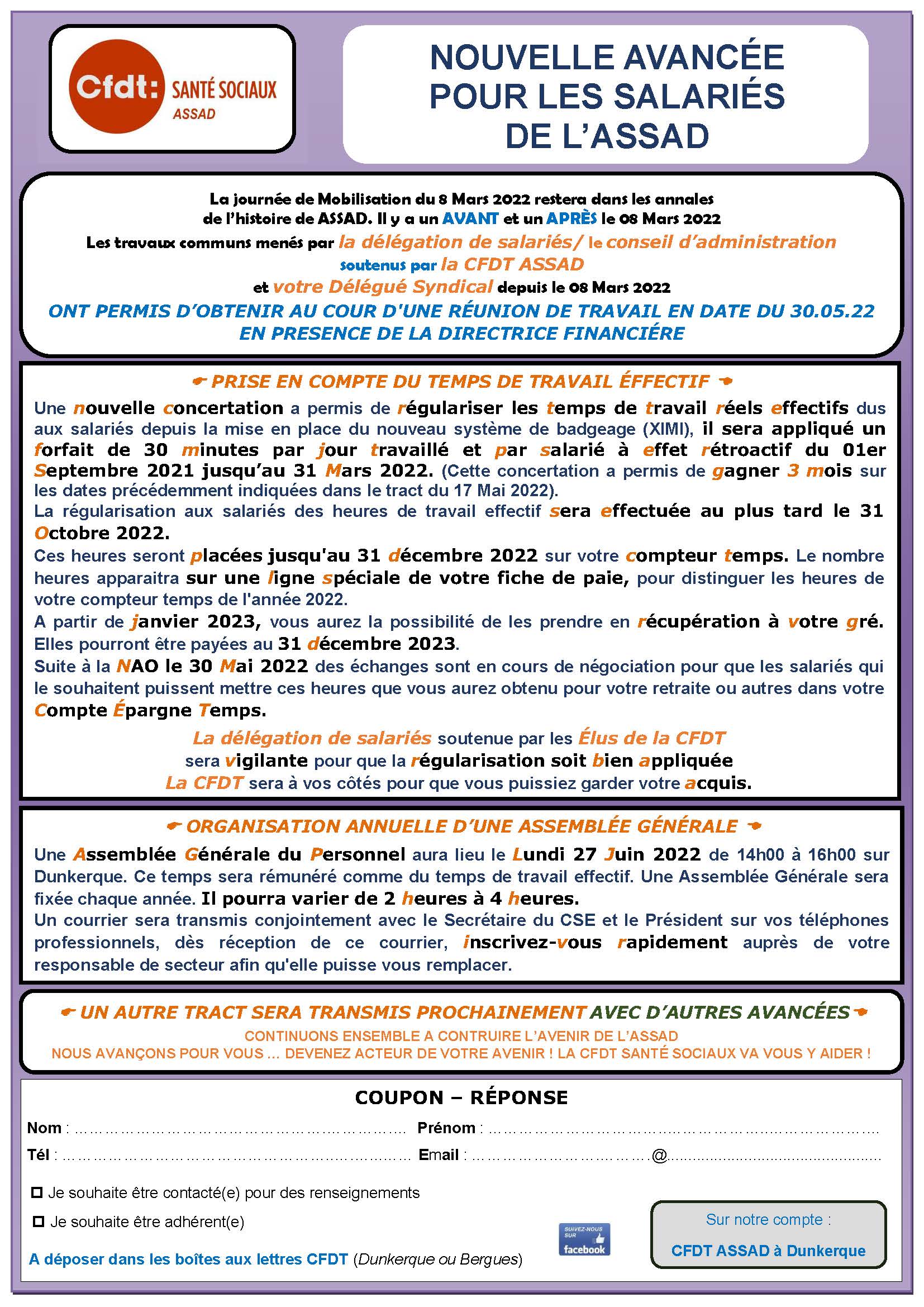 Les travaux communs menés par la délégation de salariés/le conseil d’administration soutenus par la CFDT ASSAD et votre Délégué Syndical depuis le 08 mars 2022 ONT PERMIS D’OBTENIR