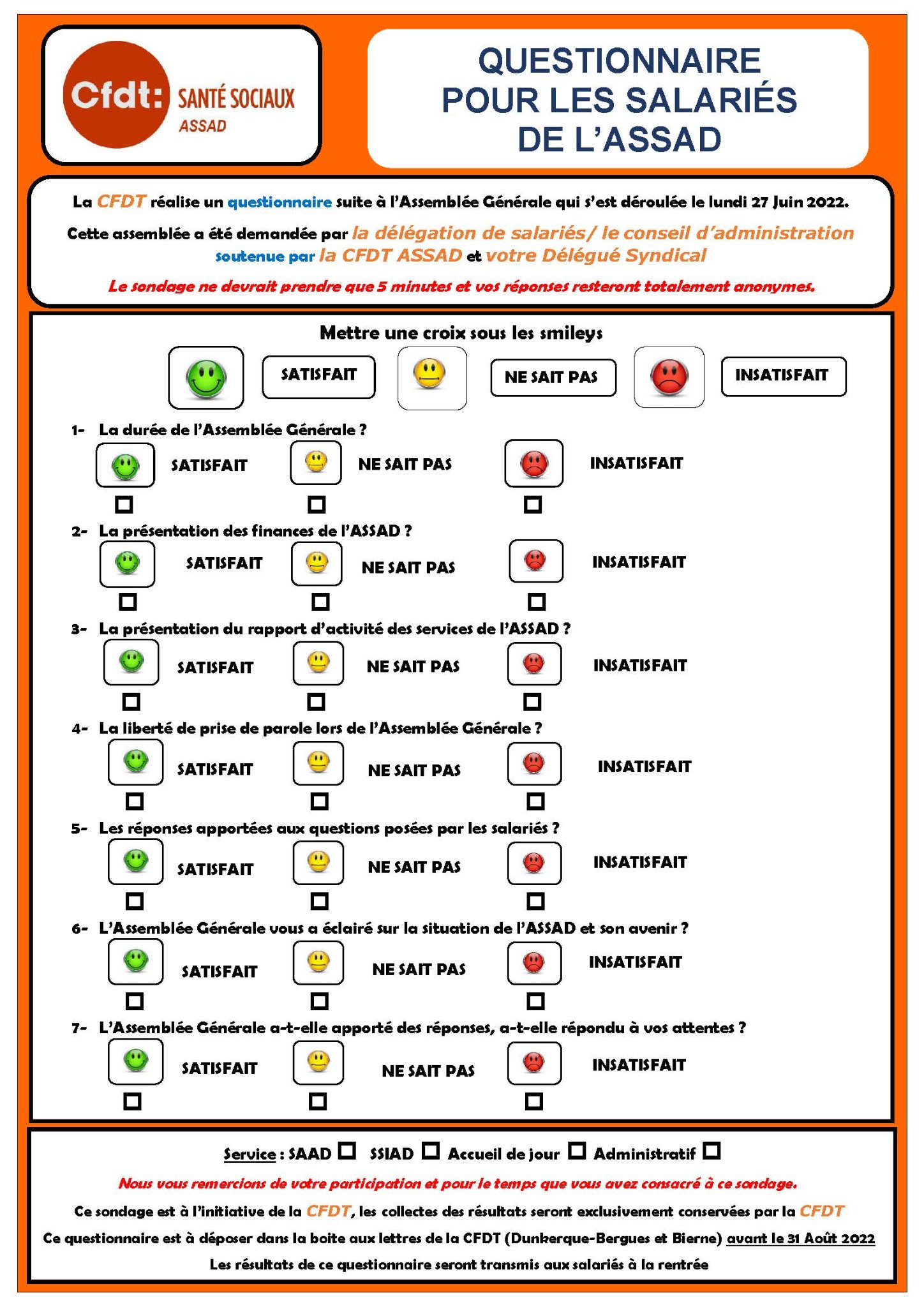 Ce questionnaire qui a été transmis dans chaque service, est à déposer dans la boîte aux lettres de la CFDT (Dunkerque-Bergues et Bierne)