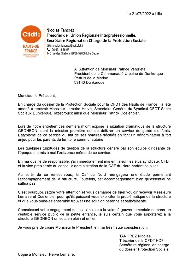 Vous trouverez ci-dessous le courrier transmis au Président de la CUD en date du 21.07.2022