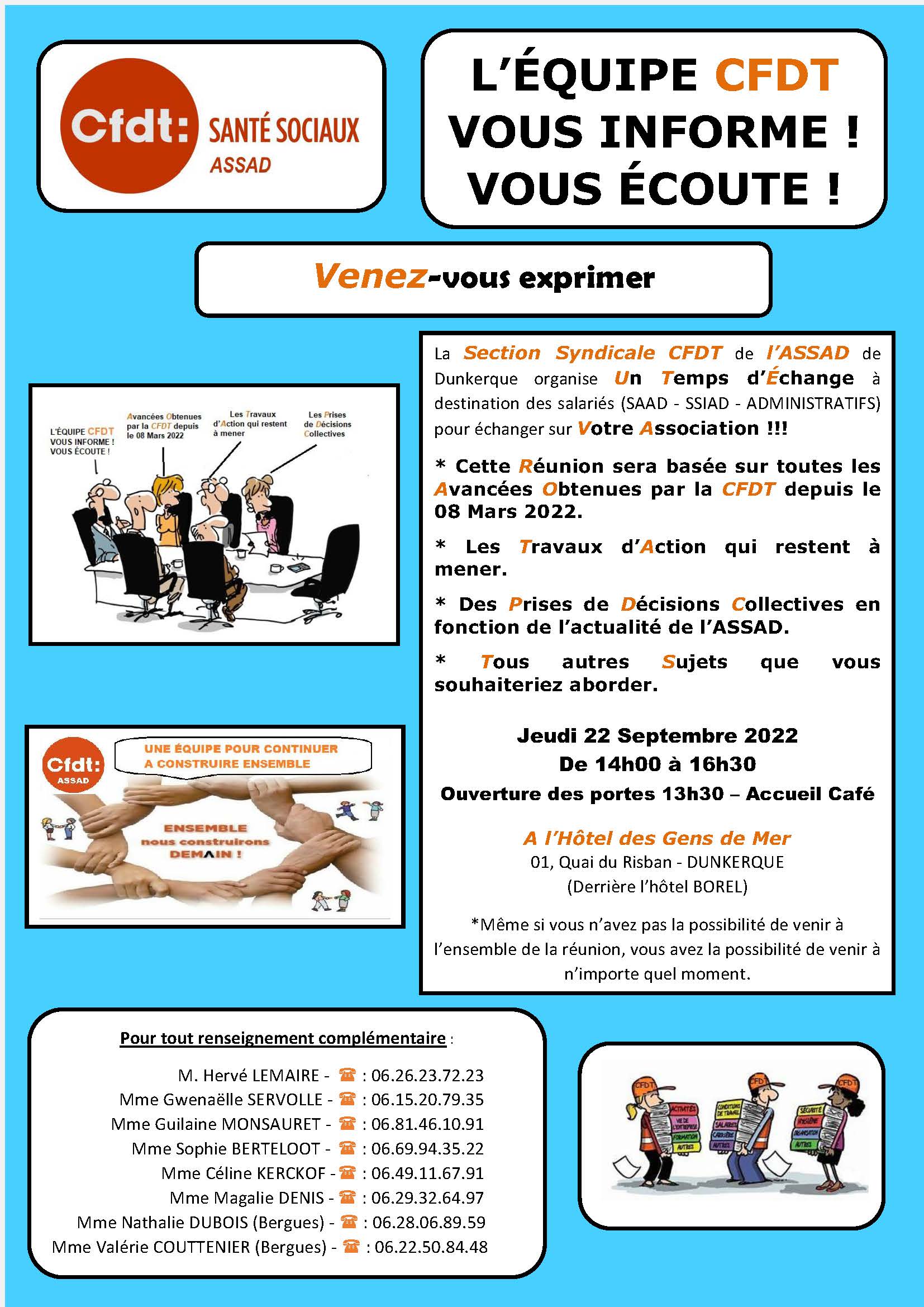 La Section Syndicale CFDT de l’ASSAD de Dunkerque organise un TEMPS D’ÉCHANGE à destination des salariés (SAAD – SSIAD – ADMINISTRATIFS) pour échanger sur Votre Association !!!