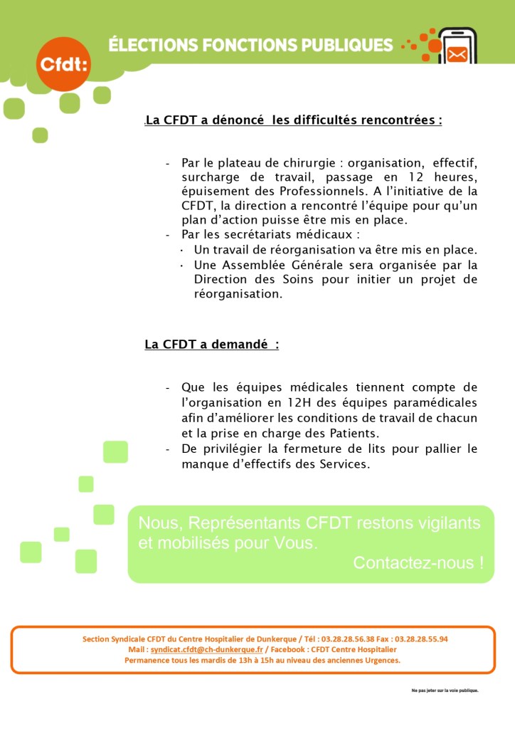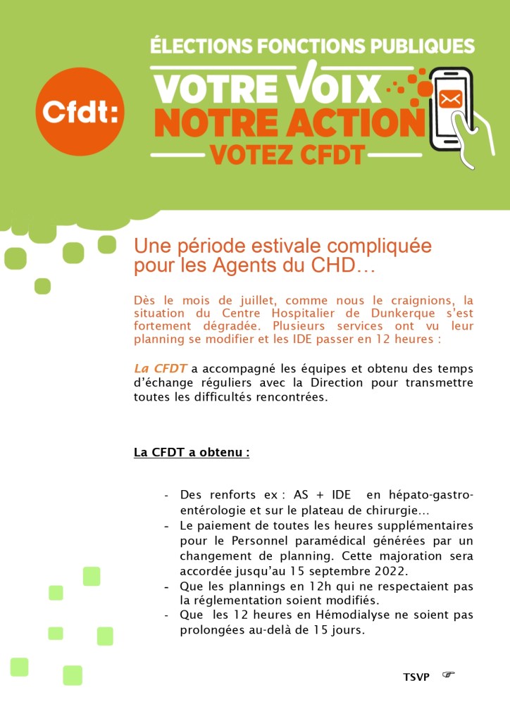 Suite à un été chargé et intense au sein du Centre Hospitalier, la section a contribuer à améliorer vos conditions de travail en obtenant du renfort de personnel, le paiement des heures sup’, modification des planning, etc…