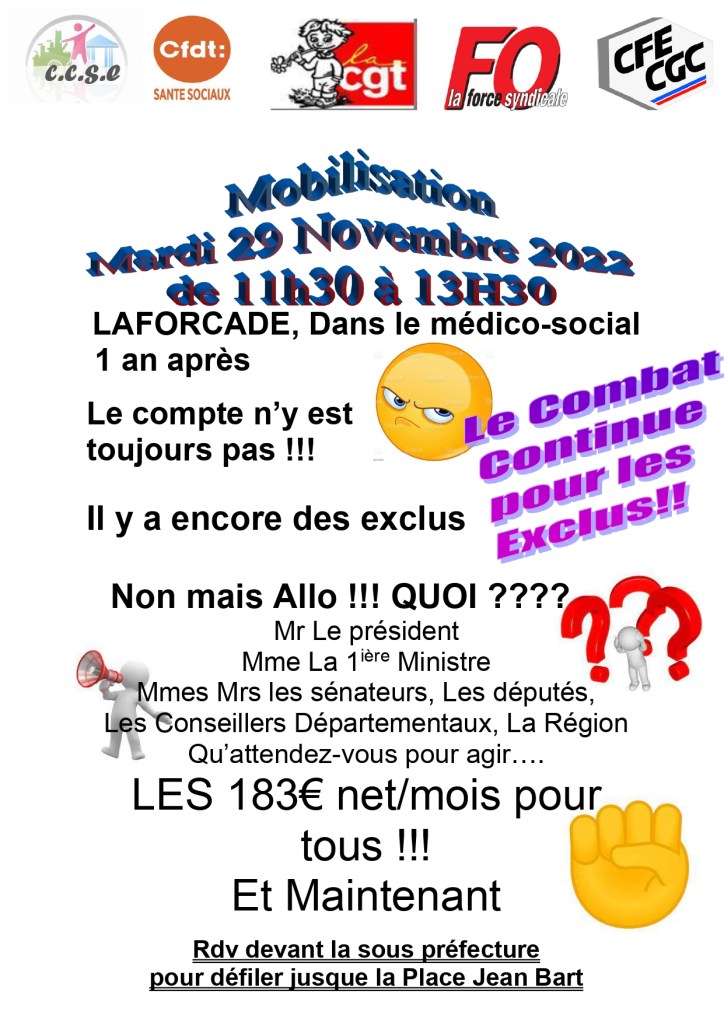 Le combat continue pour les EXCLUS des primes du Ségur dans la fonction publique et de l’indemnité LAFORCADE dans le médico social.