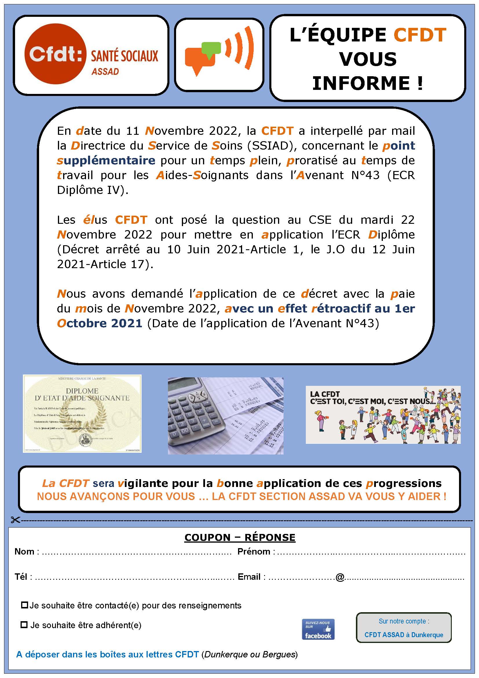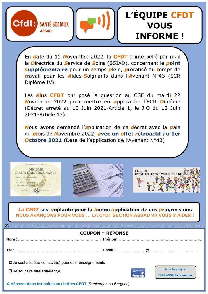 La Section Syndicale CFDT de l’ASSAD de Dunkerque a transmis un tract aux salariés du Service de Soins (SSIAD) de l’Association en date du 23 Novembre 2022 afin de vous informer sur :