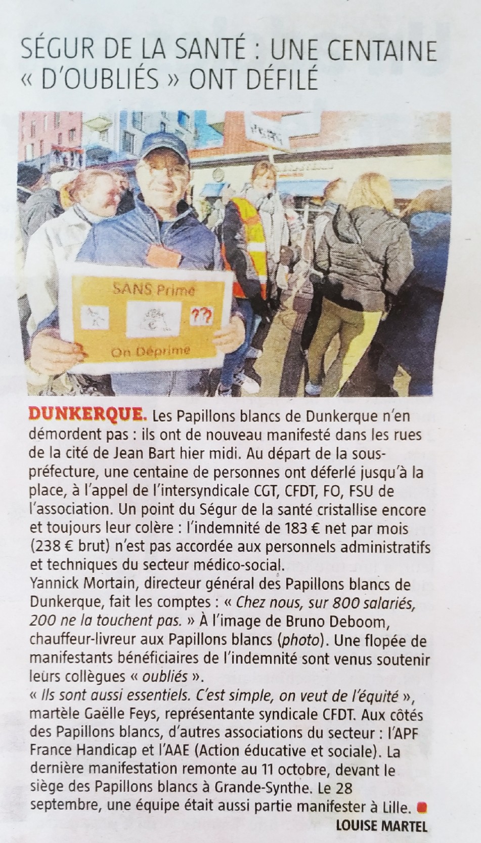 150 salariés des Papillons Blancs ont battu le pavé, à Dunkerque, pour réclamer leur part du gâteau. Vous le savez, le SEGUR de la santé a permis à des milliers de soignants d’obtenir des revalorisations, à hauteur de 183 euros nets chaque mois. Ces personnels, jugés essentiels, ont notamment été récompensés dans leur engagement pendant la pandémie. De nombreux salariés des associations sont également concernés par cette hausse, comme aux Papillons Blancs, mais certains en sont exclus. Cela concerne les administratifs, les cadres, certaines fonctions support et l’équipe de direction. Ils sont donc descendus dans la rue pour réclamer un alignement et une équité face à ces hausses de salaires.