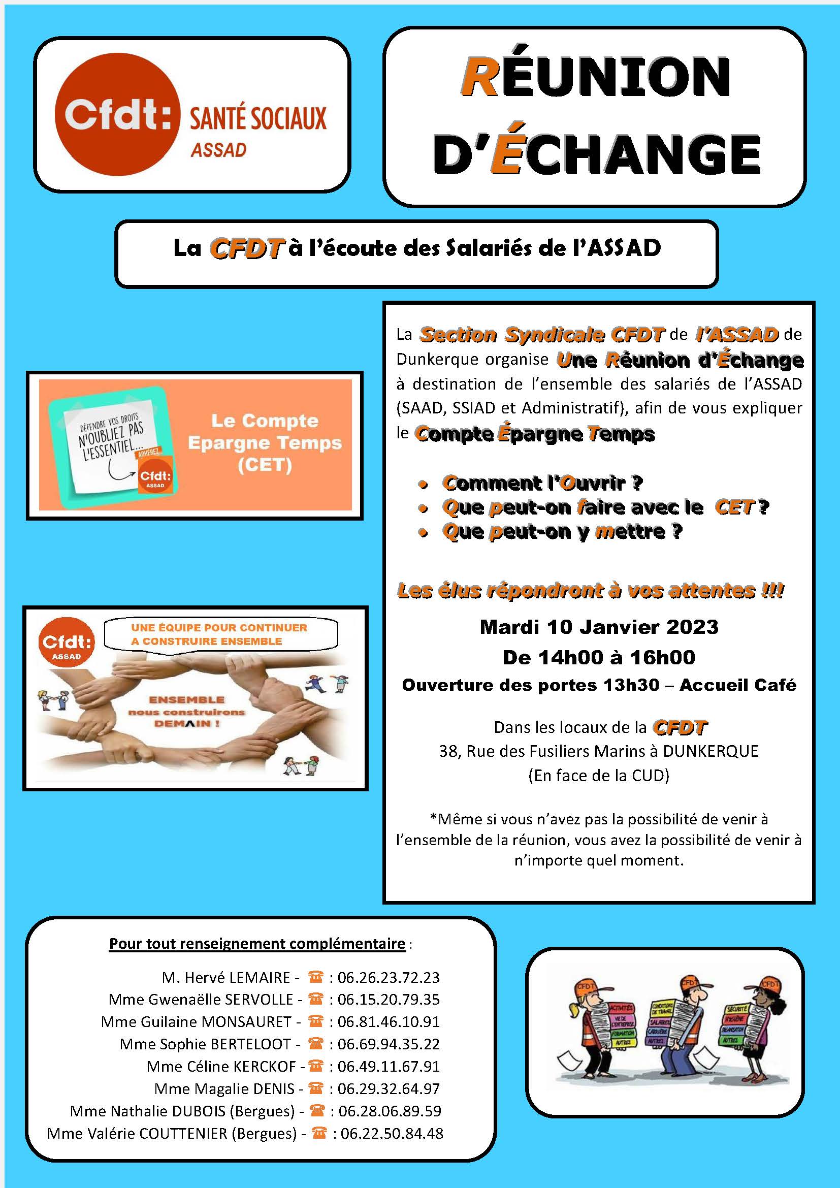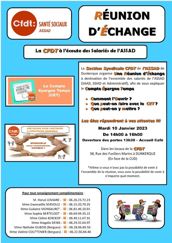 La Section Syndicale CFDT de l’ASSAD de Dunkerque organise une RÉUNION D’ÉCHANGE à destination des salariés (SAAD – SSIAD – ADMINISTRATIFS) afin de vous expliquer le Compte Épargne Temps !!!