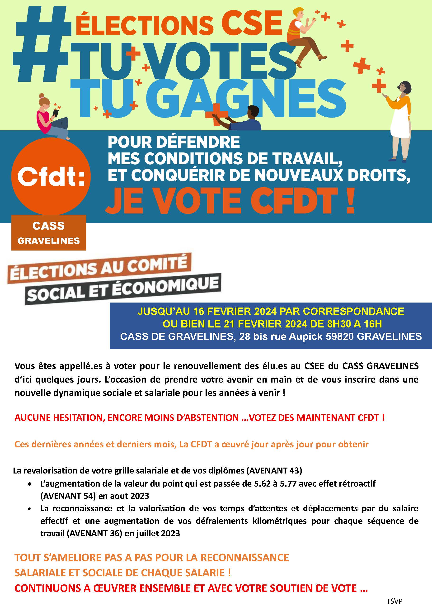 Vous êtes appellé.es à voter pour le renouvellement des élu.es au CSEE du CASS GRAVELINES d’ici quelques jours. L’occasion de prendre votre avenir en main et de vous inscrire dans une nouvelle dynamique sociale et salariale pour les années à venir !