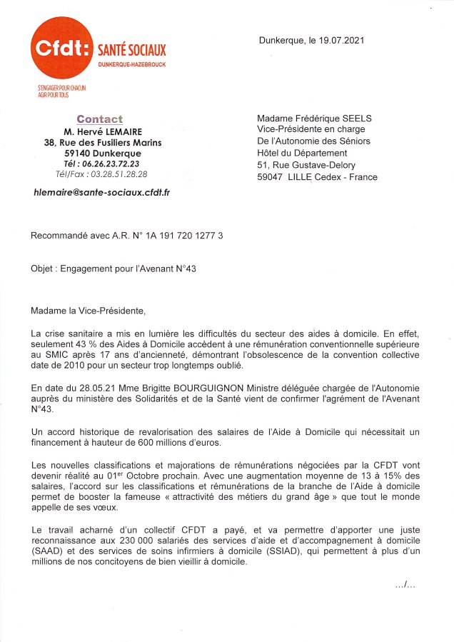 Courrier à Madame Frédérique SEELS Vice-Présidente en charge de l’Autonomie des Séniors pour la défense de l’Avenant N°43_Page_1